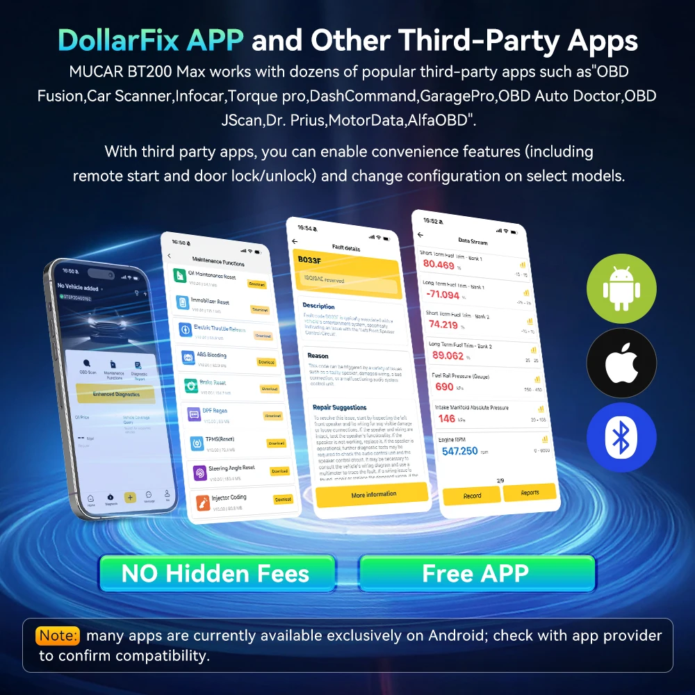 MUCAR BT200 Max works with dozens of popular third-party apps such as"OBD Fusion,Car Scanner,Infocar,Torque pro,DashCommand,GaragePro,OBD Auto Doctor,OBD JScan,Dr. Prius,MotorData,AlfaOBD".