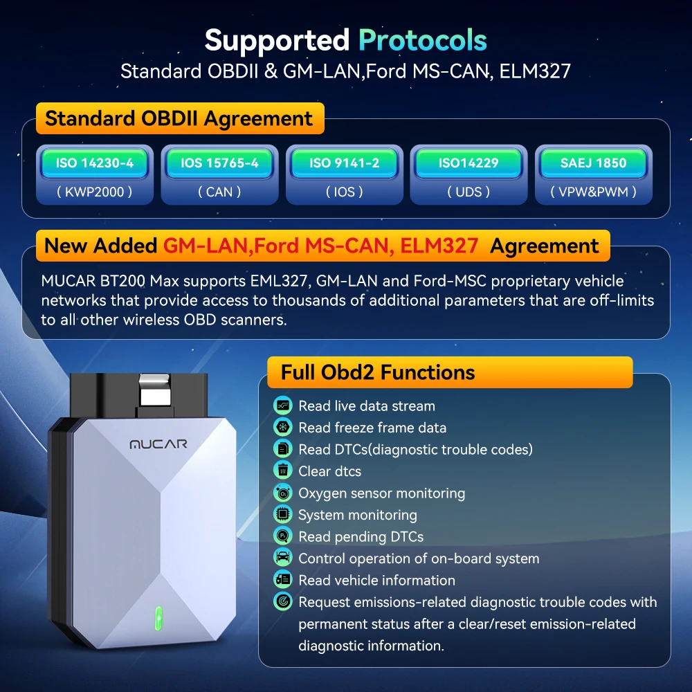 MUCAR BT200 Max supports EML327, GM-LAN and Ford-MSC proprietary vehiclenetworks that provide access to thousands of additional parameters that are off-limitsto all other wireless OBD scanners.